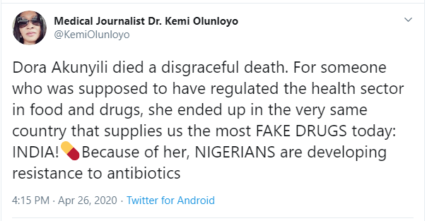 Today her target is the late Dr Dora Akunyili, a former DG of NAFDAC and Minister of Information.