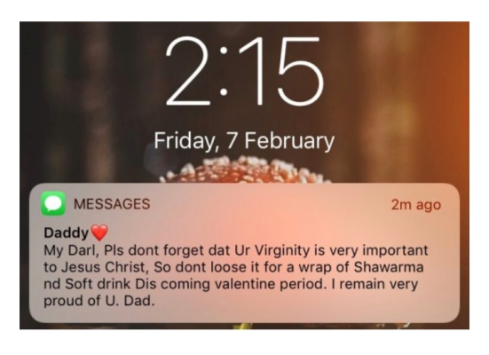 A lady has taken to social media to share a text message she got from her father who seems worried as Valentine’s Day approaches.