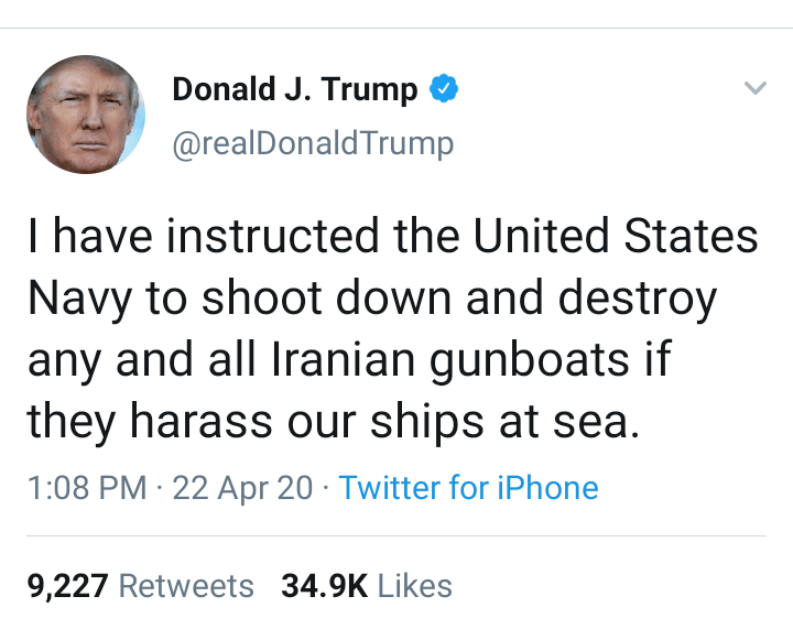 “I have instructed the United States Navy to shoot down and destroy any and all Iranian gunboats if they harass our ships at sea.”