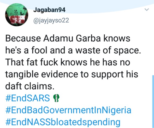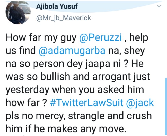 How far @adamugarba ? Soro soke generation heard you and your lawyer ran away . Aren’t you suing @jack and @Twitter anymore ?. Y’all just be disgracing yourselves and Nigeria .
