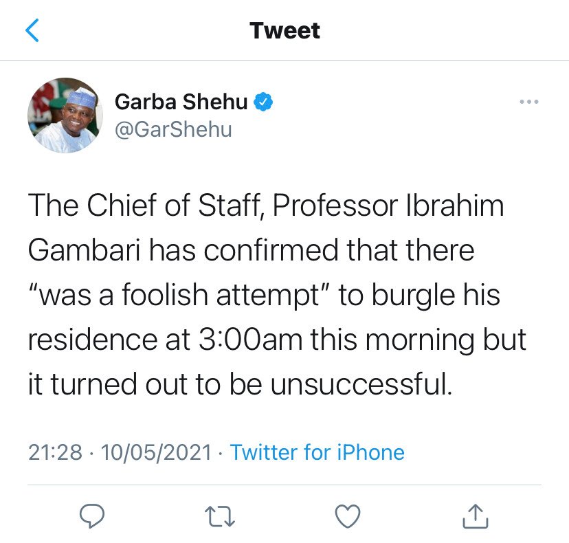 “The Chief of Staff, Professor Ibrahim Gambari has confirmed that there “was a foolish attempt” to burgle his residence at 3:00am this morning but it turned out to be unsuccessful.”