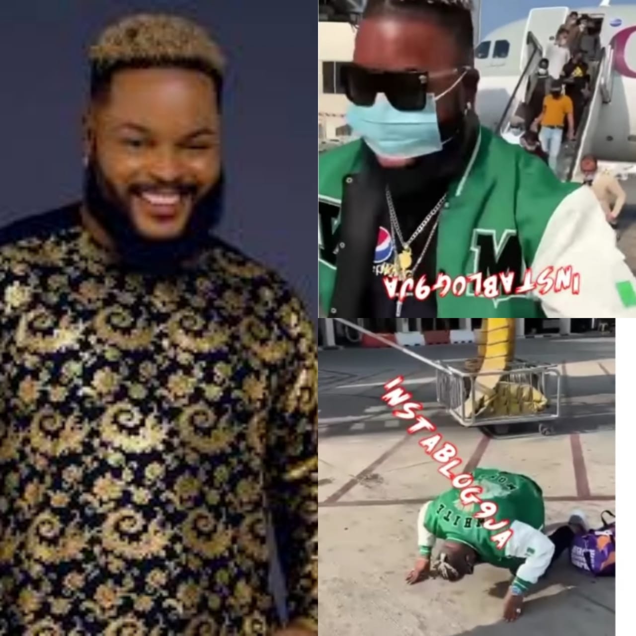 In the video, he was seen going knees to thank God after flying outside Nigeria for the first time in his life