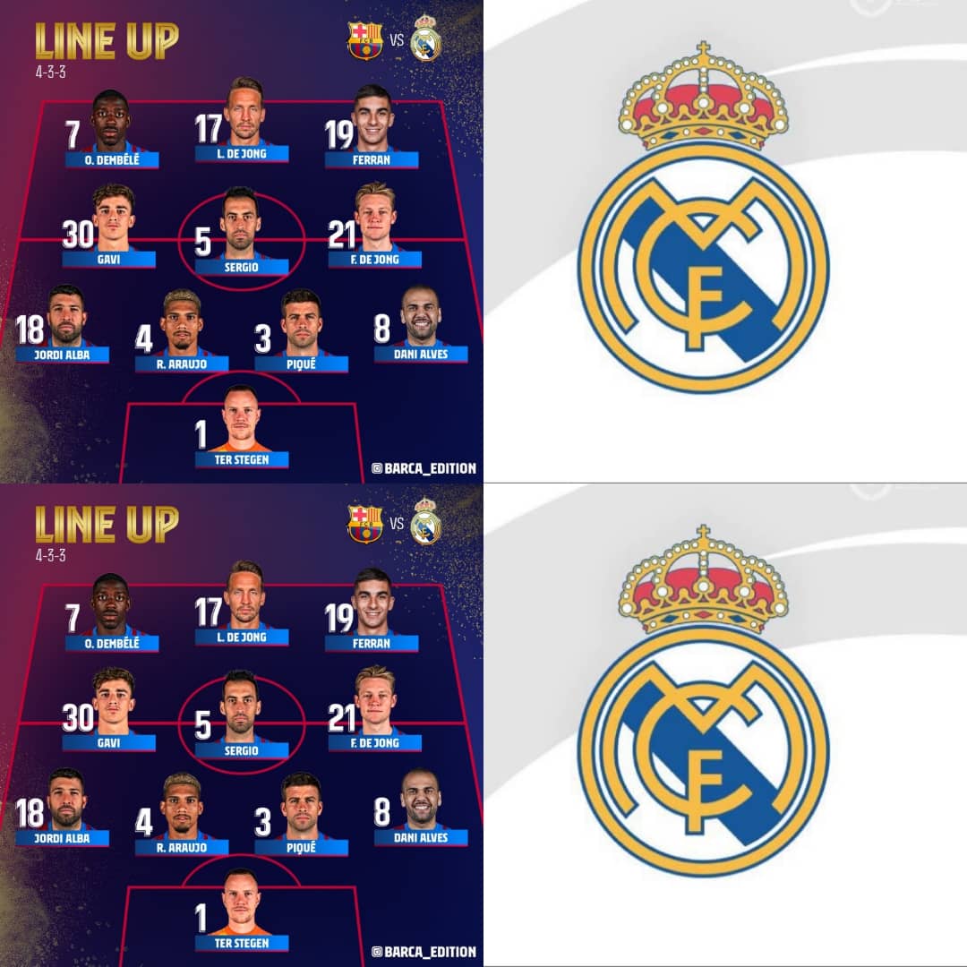 Ter Stegen; Alves, Araujo, Pique, Alba; de Jong, Busquets, Gavi; Dembele, de Jong, Torres.