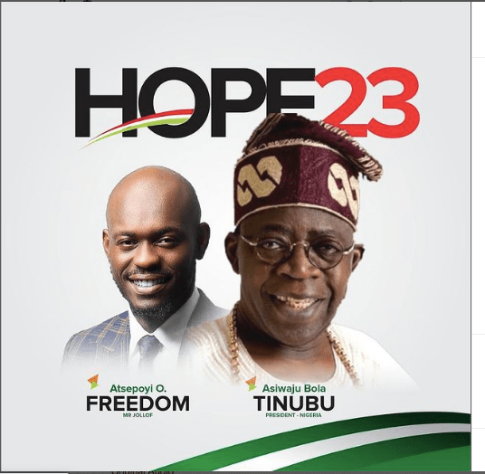 BREAKING: Mr Jollof/Tinubu Presidential Campaign Poster Emerges [PHOTO]—-Ahead of 2023 general elections, posters carrying pictures of Nigerian born Comedian and a media activist, Freedom Atsepoyi, popularly known as Mr Jollof and National Leader of All Progressive Congress (APC), Bola Ahmed Adekunle Tinubu have surface.
