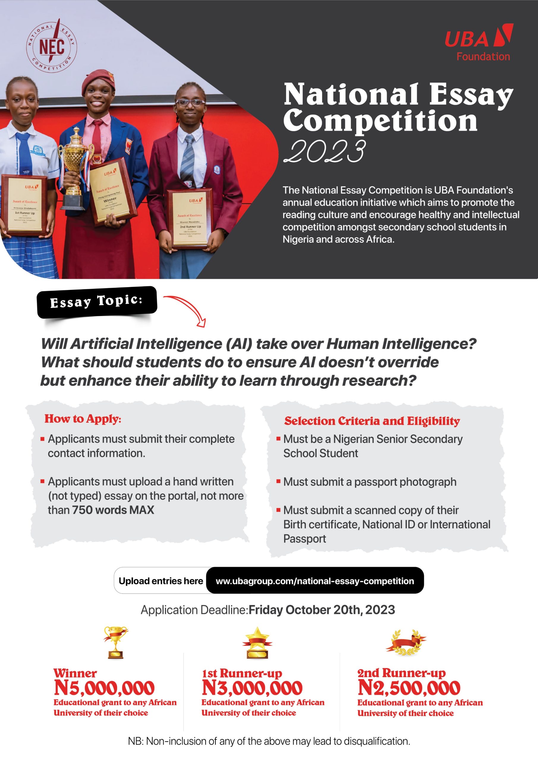This year, Senior Secondary School students in Nigeria will be expected to write on the essay topic: “Will Artificial Intelligence (AI) Surpass Human Intelligence? How Can Students Ensure AI Enhances Their Learning Through Research?,” and are to scan and upload their handwritten essays to https://www.ubagroup.com/national-essay-competition/ on or before October 20th, 2023.