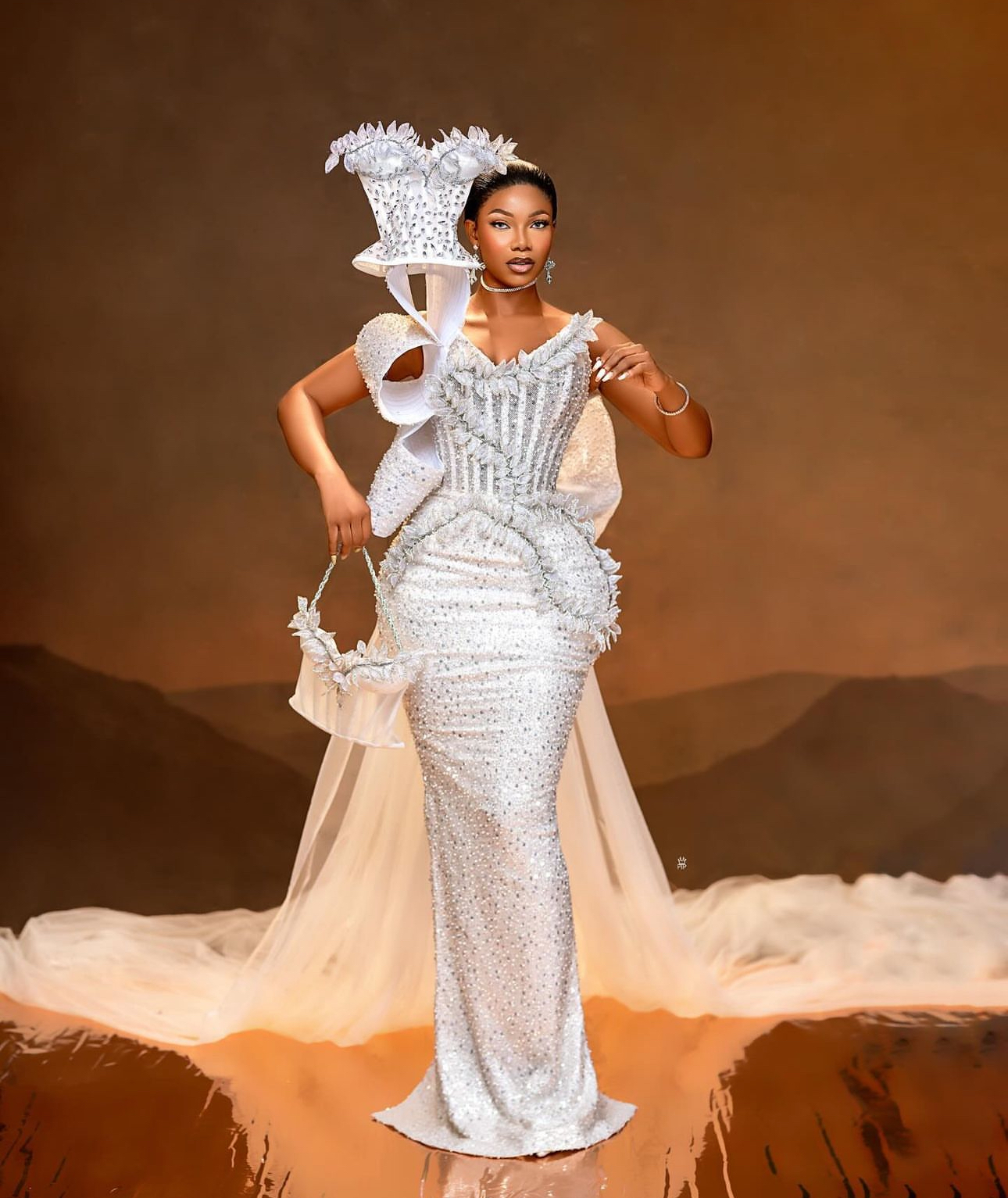At the 2024 AMVCA, Tacha wore an all-white dress adorned with stones and featuring a floating bust design on her shoulders.