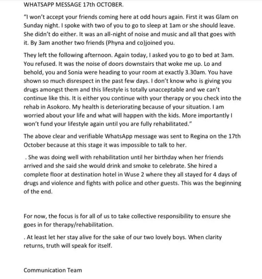 He added that Regina was doing well in rehabilitation until her birthday, when she allegedly hosted a four-day party at a hotel in Wuse 2, reportedly involving drugs, violence, and clashes with police.